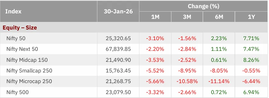 According to Motilal Oswal Mutual Fund’s Global Market snapshot report, Nifty 500 remained flat in January but closed the year with a +6.94% gain. Midcap and Smallcap were negative for the month, down by around 3.53% to 5.52%. The Nifty 50 declined by 3.10% over the last one month. The index declined 1.56% over three months, but grew 2.23% over six months, and 7.71% on a one-year basis. The Nifty Next 50 posted a monthly loss of 2.20%. The index recorded returns of -2.84% over three months, 1.11% over six months, and 7.47% over one year. The Nifty Midcap 150 declined 3.53% over the one-month period and over the last three months, six months, and one year, the index delivered returns of -2.52%, 0.61%, and 8.26%, respectively. The Nifty Smallcap 250 declined 5.52% over the month. The index saw a decline of 8.95% over three months, while returns stood at −8.05% over six months and −0.55% over the one-year period. The Nifty Microcap 250 declined 5.66% over the last one month and delivered returns of −10.58% over three months, −11.14% over six months, and −6.44% over one year. The Nifty 500 recorded a monthly decline of 3.32% and over the last three months, six months, and one year, the index delivered returns of -2.66%, 0.72%, and 6.94%, respectively.