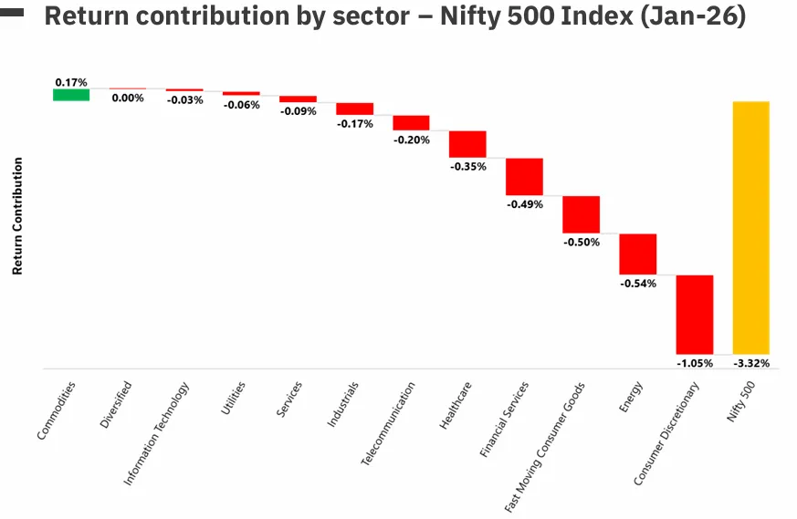 Commodities was the only positive contributor, while all other sectors contributed negatively and dragged the Nifty 500 lower.