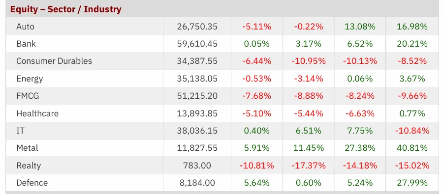 Nifty 50 was down 3.1%, while Midcap and Smallcap fell 3.5% and 5.5%, respectively, reflecting pressure in the broader market.