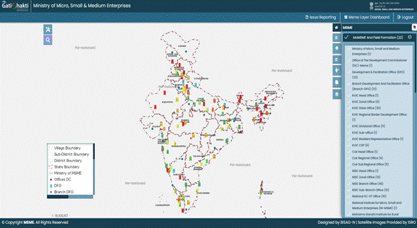 PM Gati Shakti: The Ministry has aligned digital planning with the PM Gati Shakti National Master Plan by geo mapping nearly 1 Lakh assets across eight thematic GIS layers and 44 sub layers, including field formations. This end-to-end geo enablement spans ZED certified MSMEs and 93,823 PMEGP beneficiaries and is sustained through regular information updates via the mobile app, a three-tier validation mechanism, and a live administrative dashboard. Together, these capabilities deliver granular visibility and spatial intelligence that will help optimize existing schemes—from precise site selection and resource allocation to improved beneficiary targeting and convergence across programmes—while also supporting new initiatives with evidence-based decision making (e.g., identifying infrastructure gaps, modeling alternative delivery scenarios, and calibrating last mile service delivery for measurable outcomes).
