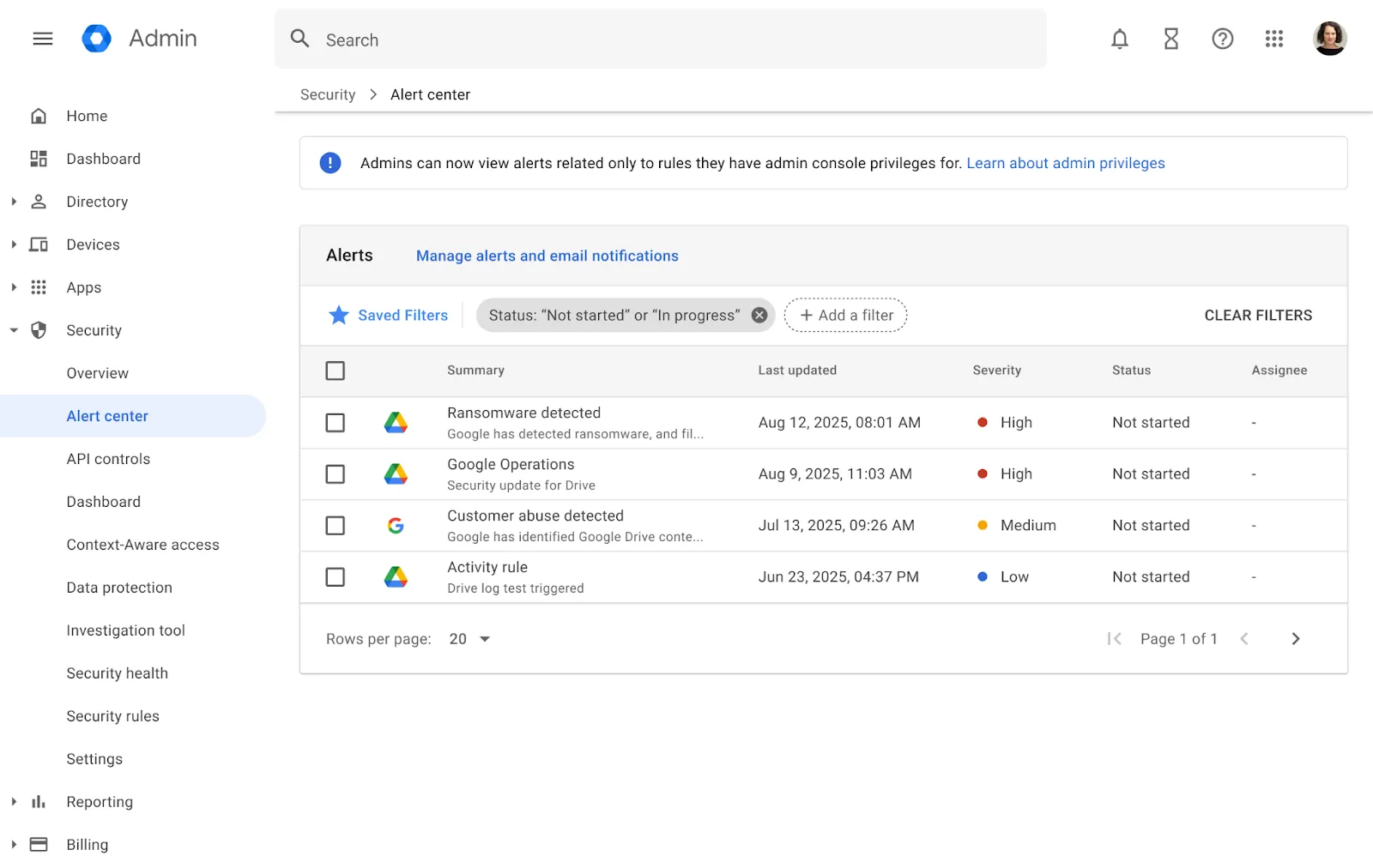 An alert in the Admin console showing a notification for detected ransomware