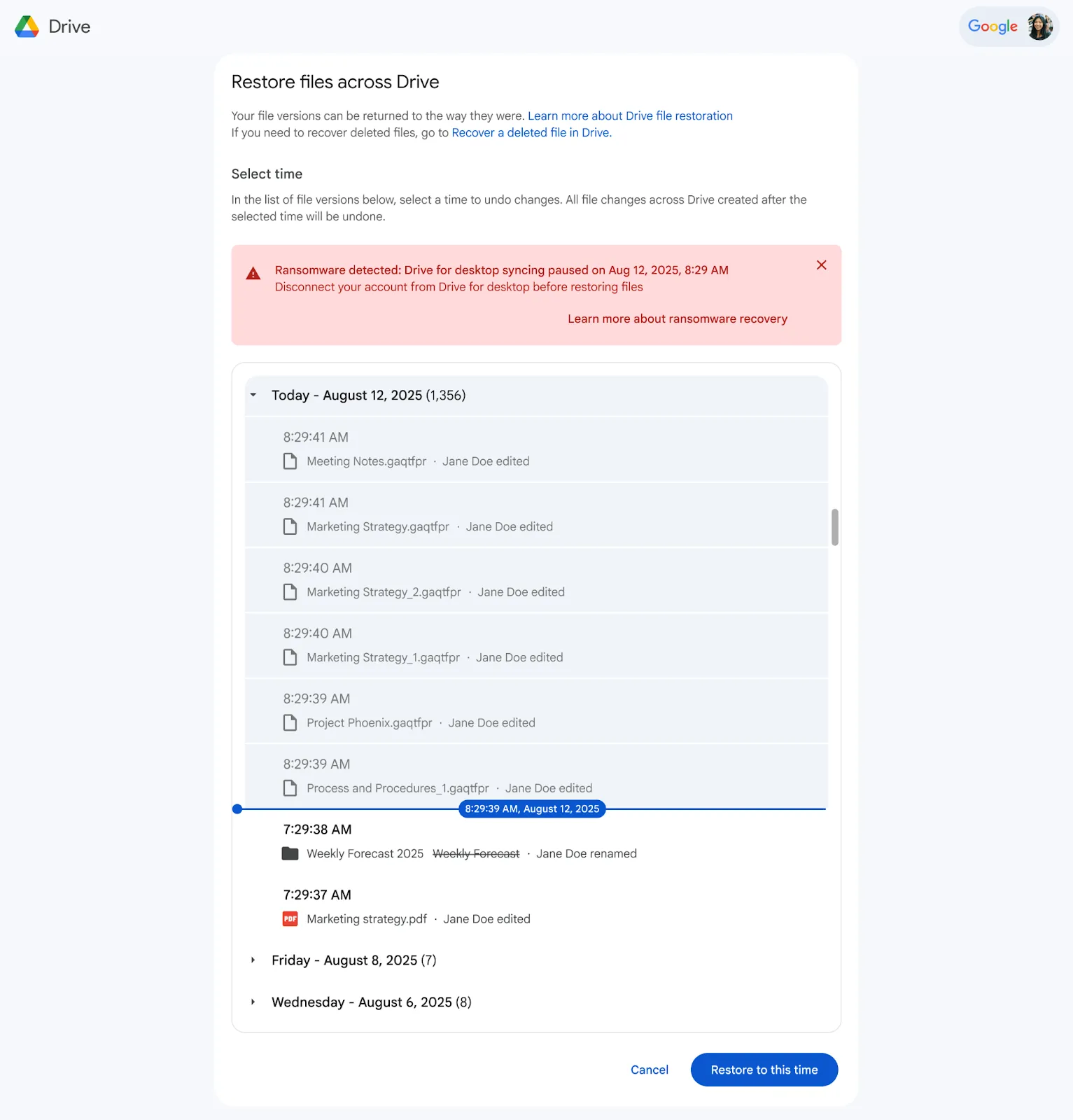 While native Workspace documents (e.g., Google Docs, Sheets) are not impacted by ransomware and ChromeOS has never had a ransomware attack, ransomware is a persistent threat for other file formats (e.g., PDF, Microsoft Office) and desktop operating systems (e.g., Microsoft Windows). That’s why we're enhancing Google Drive for desktop with AI-powered ransomware detection to automatically stop file syncing and allow users to easily restore files with a few clicks.