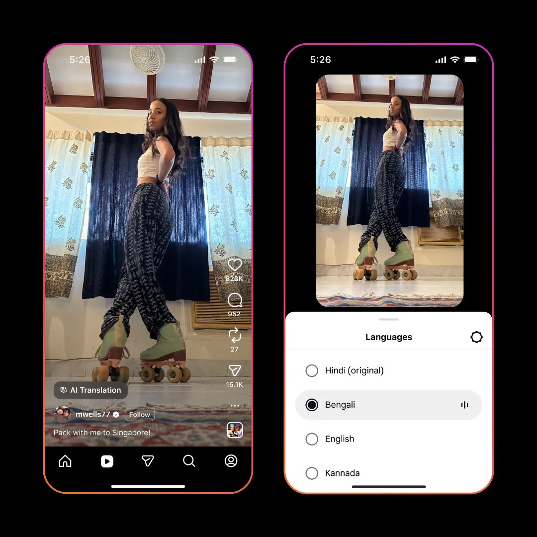 We’re excited to announce in the coming months you will soon be able to use Meta AI to translate reels in five new Indian languages, helping you discover more entertaining content from across India and around the world. In October, we launched the ability for creators to dub and lip-sync their reels to and from English, Hindi, Spanish, and Portuguese, helping them reach more people globally. Now, the same capability will soon be available in Bengali, Tamil, Telugu, Kannada, and Marathi.