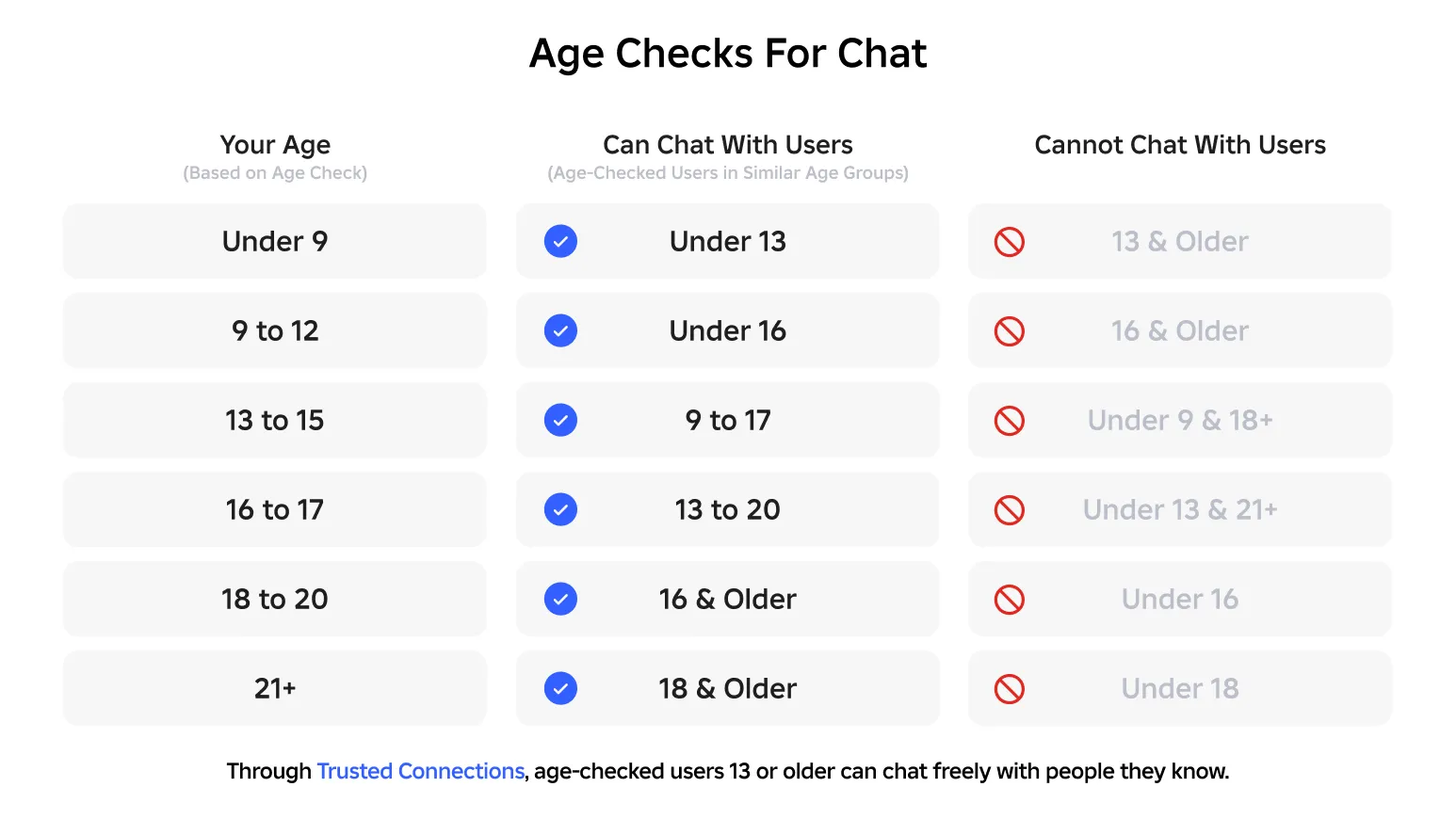 Once users complete an age check, they are assigned to one of six age groups: under 9, 9–12, 13–15, 16–17, 18–20, and 21+. By default, users in each age group can chat with users in the groups directly above and below theirs (i.e., users 9-12 can chat with users in their own group, as well as those in the under 9 and 13-15 groups.)