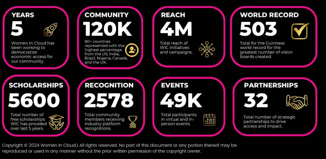 COMMUNITY: At its core, Women In Cloud serves as an economic preparedness platform for women in the tech and film ecosystem. Over the past five years, we have expanded to over 120,000 members spanning 80 countries